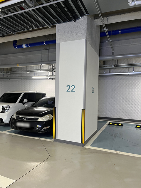 6. 직진도로 끝에, 좌측에는 상가 입구가 있고 우측에는 22번 기둥이 있는 곳을 확인하실 수 있습니다! 이 입구로 들어와주세요!!